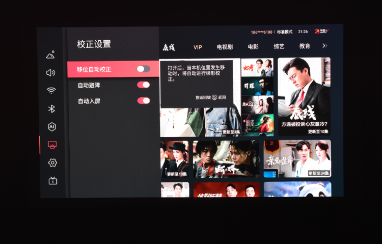 第二个注意事项就是,如果和有码君一样采用支架安装的方式,就要第一时间在设置中将“位移后自动校准”功能关闭,因为当你触碰投影仪后画面会自动对焦+梯形校正,影响我们的观看体验。