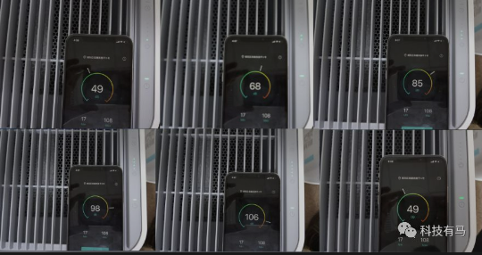 在夜间模式和自动模式下,空气净化器的噪音分贝始终保持在49分贝上下;在一档模式下,空气净化器的噪音分贝同样保持在49分贝上下,稍稍与空气净化器拉开一段距离就完全听不到产品工作的声音;在二挡和三档模式下,空气净化器的工作噪音在60-90之间,能够听见比较明显的风声;在四挡和五档模式下,产品的工作噪音就非常明显了,噪音分贝在100分贝左右。