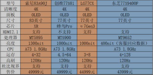 上图是有码君整理的其他大牌OLED旗舰的参数表,高下立判。有码君认为,索尼的83A90J是2021年当之无愧的“最值大屏”。83A90J从配置上看全面占优。不仅屏幕大了,索尼看家的XR芯片加持下,A90J在色彩、暗部细节、人物肤色方面有较明显的提升,比较自家77A9G发布时可谓是加量不加价。
