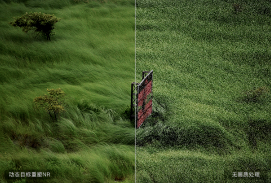 动态目标重塑NR,看着下图比较好解释。如果以静态的角度来看待一片风吹过草坪,那每每一颗小草都是个体,在现在高帧率视频以及提高清晰度的算法的加持下,可能就会变成右图那样的效果,锐度很高也很清楚,但是和肉眼的感受是完全不同的。动态目标重塑NR可以在3D的空间范围内追踪目标个体的独立运动轨迹,把运动对象和背景噪声有机的分离开,进行精准的降噪,而不是一刀切的降噪。那么就能产生左图那样的效果,草坪与小树的边界清晰,但是小草有着“风吹麦浪”的既视感,这才更为真实。这样的画面分析思路,一定是有足够积累和专业调校的品牌才可以做到的。