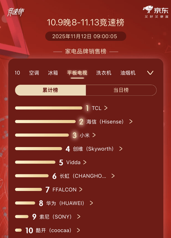 更令人瞩目的是,就在刚刚结束的双十一全周期,TCL在京东平板电视竞速榜中以绝对优势登顶冠军宝座,用实打实的市场成绩印证了用户的认可。从全球市场的稳步追赶,到国内电商大促的摘冠夺魁,TCL 的亮眼表现并非偶然,而是其多年深耕技术创新、坚定布局中高端战略、全面拓展全球市场的必然结果。在行业普遍用 “过去的逻辑” 反复内卷时,TCL 早已换道超车,用技术重构竞争规则,走出了一条中国品牌自主创新的全球领跑之路。