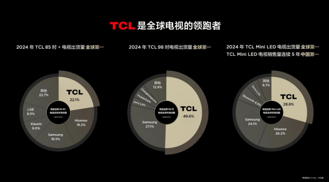 它不仅是 Mini LED 技术的开创者,更是 QLED 量子点技术、QD-Mini LED 技术以及第四代液晶电视的首发者,在多重技术赛道的提前布局,让其在行业变革中占据了先发优势。据 TCL 电子官方披露,2024 年其电视全球出货量达 2900 万台,同比增长 14.8%,全球市占率提升至 13.9%;其中 85 吋 + 电视、98 吋电视及 Mini LED 电视出货量均表现突出,Mini LED 电视全年出货量更是同比增长 194.5%,达 170 万台。这些成绩的背后,是中国品牌在显示技术领域从跟跑、并跑到部分领跑的角色蜕变。