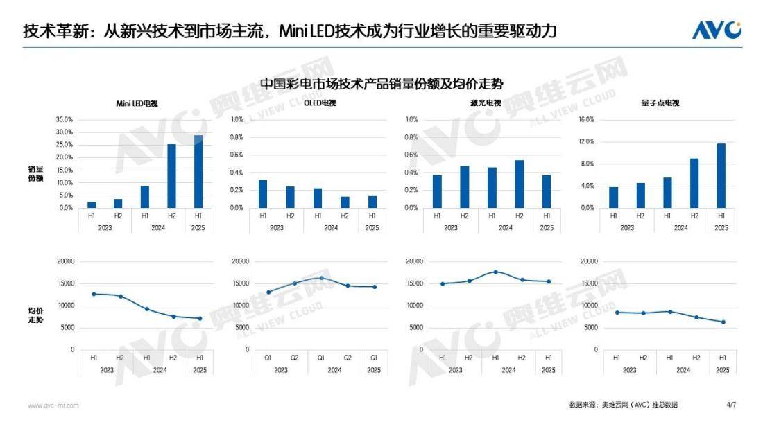 二是Mini LED主导高端市场重构。Mini LED凭借高画质、成本优势实现对OLED的弯道超车。其通过数千至数万颗微米级灯珠的分区控光技术,既保留LCD的高亮度特性,又实现媲美OLED的对比度表现,同时还实现寿命延长、成本降低。更关键的是,Mini LED在85英寸以上大尺寸市场无良率瓶颈,完美匹配家庭影院消费需求。Mini LED技术成为拉动价值增长的核心引擎。奥维云网(AVC)推总数据显示,2025上半年彩电市场Mini LED电视销量渗透率大幅增长至29%,销量同比增长超2倍,无论是从市场份额还是规模增速上看,Mini LED无疑成为彩电市场成长性最为良好的细分赛道。
