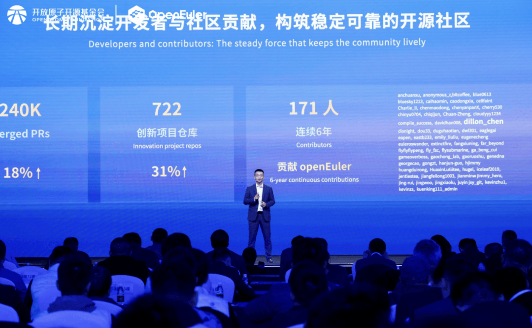 从社区贡献的维度看,openEuler 早已超越单纯的代码协作平台。六年间,社区共推出 3 个 LTS 版本和 9 个创新版本,举办 120 多次开发者活动,成立 100 多个特别兴趣小组,累计完成 24 万次代码合入请求和 441 万次 Review,孵化 700 多个创新项目仓库。更值得关注的是,社区中 40% 的个人开发者为 “为爱发电” 的无明确归属贡献者,正如开放原子开源欧拉委员会主席熊伟所说:“这些开发者不知道从哪儿来,发不发工资、谁给发工资都不清楚,但他们的活跃度很高,说明中国人的创造力其实一点不差。” 这些个人开发者与企业成员共同构成了社区的 “双引擎”—— 企业保障了商用级的质量、合规与知识产权底线,个人开发者则注入了持续的创新活力。