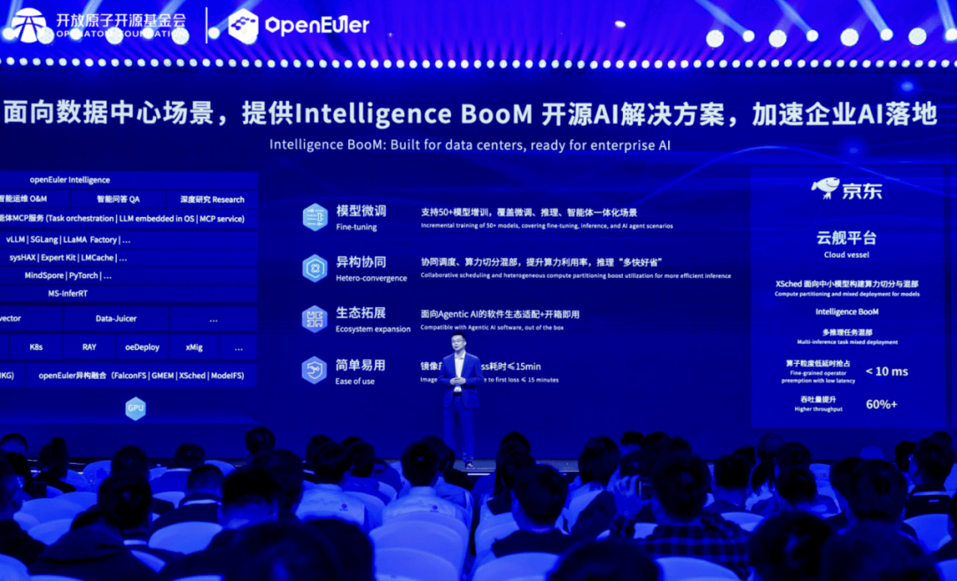 在工业领域,openEuler 孵化的 MICA 混合关键性部署、UniProton 实时内核等技术,已在中国南方电网、菲尼克斯等企业落地,推动 OT 领域的 IT 化转型;在数据中心场景,Intelligence BooM 全栈开源 AI 解决方案通过异构协同推理,效率提升 10%~30%,已在宝德、华鲲振宇等伙伴实现商用。这些案例证明,openEuler 已不再是实验室中的技术原型,而是真正能为千行万业创造价值的产业级解决方案。