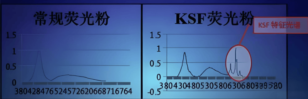 KSF 荧光粉具有极窄的半波宽,能够激发出色纯度极高的红光,其效果在视觉上可以媲美纯激光或量子点,同时完美规避了红色 LED 芯片寿命短、衰减快、成本高的问题。