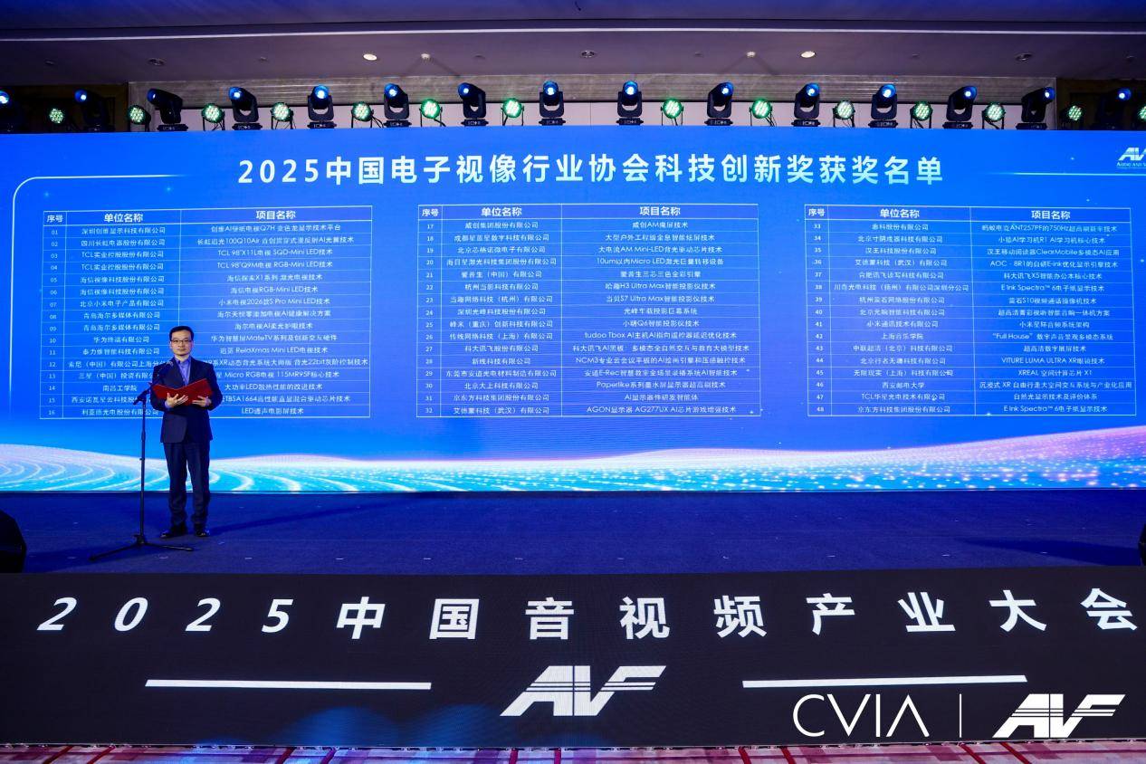 大会现场,中国电子视像行业协会执行会长郝亚斌和秘书长董敏分别宣布了获得年度人物“彩虹奖”和年度创新成果“科技创新奖”的名单。