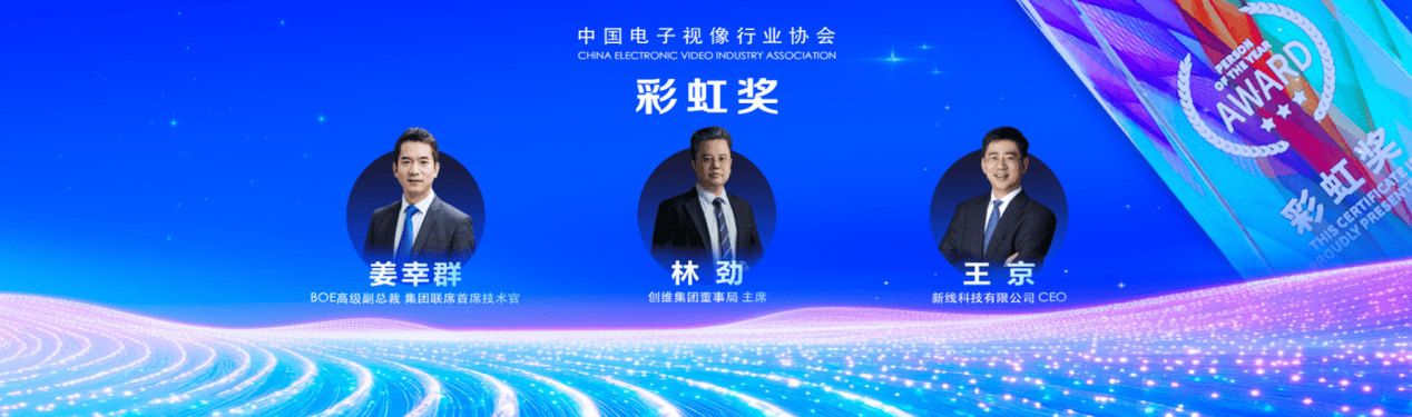 2025年度“彩虹奖”的三位获得者分别是京东方科技集团股份有限公司高级副总裁、联席首席技术官 姜幸群,创维集团有限公司董事局主席 林劲,新线科技有限公司CEO王京。三者的获奖理由分别是:推动AI赋能显示工业。构建全球领先的AI画质增强体系和全链路AI质检体系,实现裸眼3D、自然交互与AIGC内容生成在终端落地;打造基于智能技术系统、OTT互联网等平台基础,广泛覆盖智慧屏、智能家居等智能终端的软硬一体化科技生态;致力于智能交互、软件生态及前沿材料科学等关键领域,并转化为具备高度商业价值的会议与教育场景音视频产品解决方案。