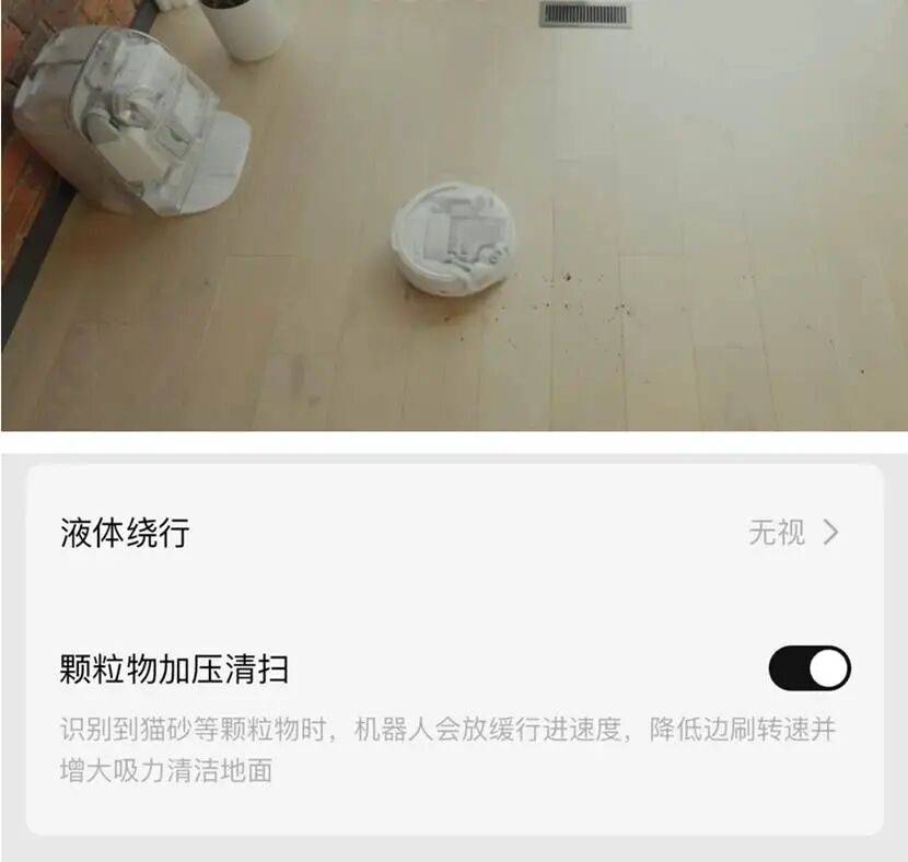 Zhou 还向我分享了一个非常打动他的细节:作为养猫用户,最怕扫地机推着猫砂到处跑。而大疆 ROMO 在最新的固件中优化了这一逻辑——当识别到猫砂等颗粒物时,机器人并非简单路过,而是会“放缓行进速度,降低边刷转速以防止打飞颗粒,同时瞬间增大吸力” 。这种对于特定场景的精细化算法处理,让 Zhou 觉得这才是真正的智能,而且这种固件更新的速度让他感觉机器在不断“进化” 。