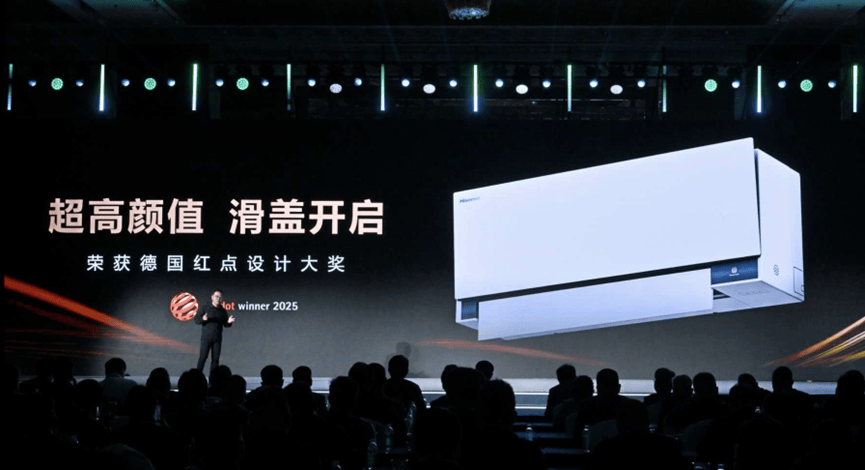 海信空调智慧风 E5 系列最引人瞩目的,莫过于那份斩获 2025 年德国红点设计大奖的首创滑盖设计 。