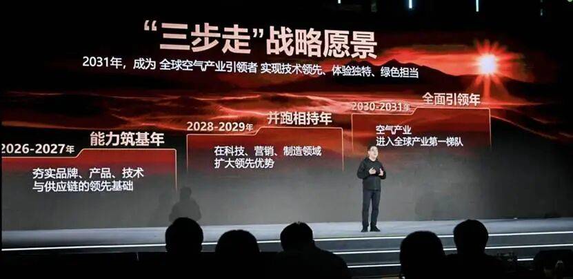 这份不被短期利益裹挟的长期主义,这份始终以技术定义时代的初心,最终汇聚成了海信空气产业清晰的未来航向。在发布会上,殷必彤正式公布了海信空气产业 “三步走” 的战略愿景:到 2031 年,成为全球空气产业引领者,做到技术领先、体验独特、绿色担当。从 2026 到 2027 年的能力筑基,到 2028 到 2029 年的并跑相持,再到 2030 到 2031 年的全面引领,海信用清晰的规划,向整个行业宣告了它奔赴全球第一梯队的决心。