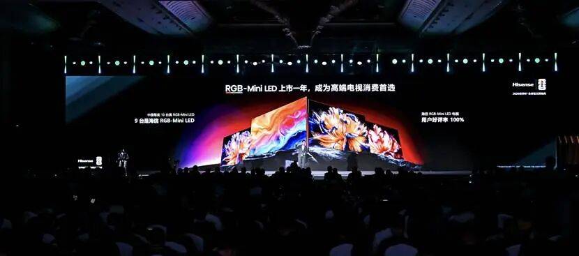 但更值得骄傲的是,当国际巨头的产品还停留在展会阶段时,海信的 RGB-Mini LED技术,已经完成了从三芯到四芯的迭代,形成了从顶级旗舰到主流爆款的全产品矩阵,走进了全球用户的客厅。在中国市场,每卖出 10 台真 RGB-Mini LED 电视,就有 9 台是海信的,用户好评率达到了 100%。