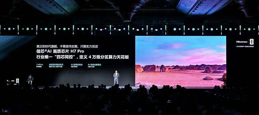 而能驾驭这套四芯架构的,正是 UX2026 款搭载的全新一代信芯 ® AI 画质芯片 H7 Pro,这也是行业唯一能实现四芯同控的画质芯片,堪称电视界的 “5090 级独显”。为了驯服四基色背光,海信直接把芯片的控色精度拉升到了行业最高的 134bits,要知道,当前顶级 QD-OLED 的控色精度仅在 30bits 左右,二者的算力差距,可想而知。134bits 的控色精度,意味着这颗芯片能分辨百万亿级的色彩差异,哪怕是人眼几乎难以察觉的色彩层次,它都能精准捕捉、完美呈现。